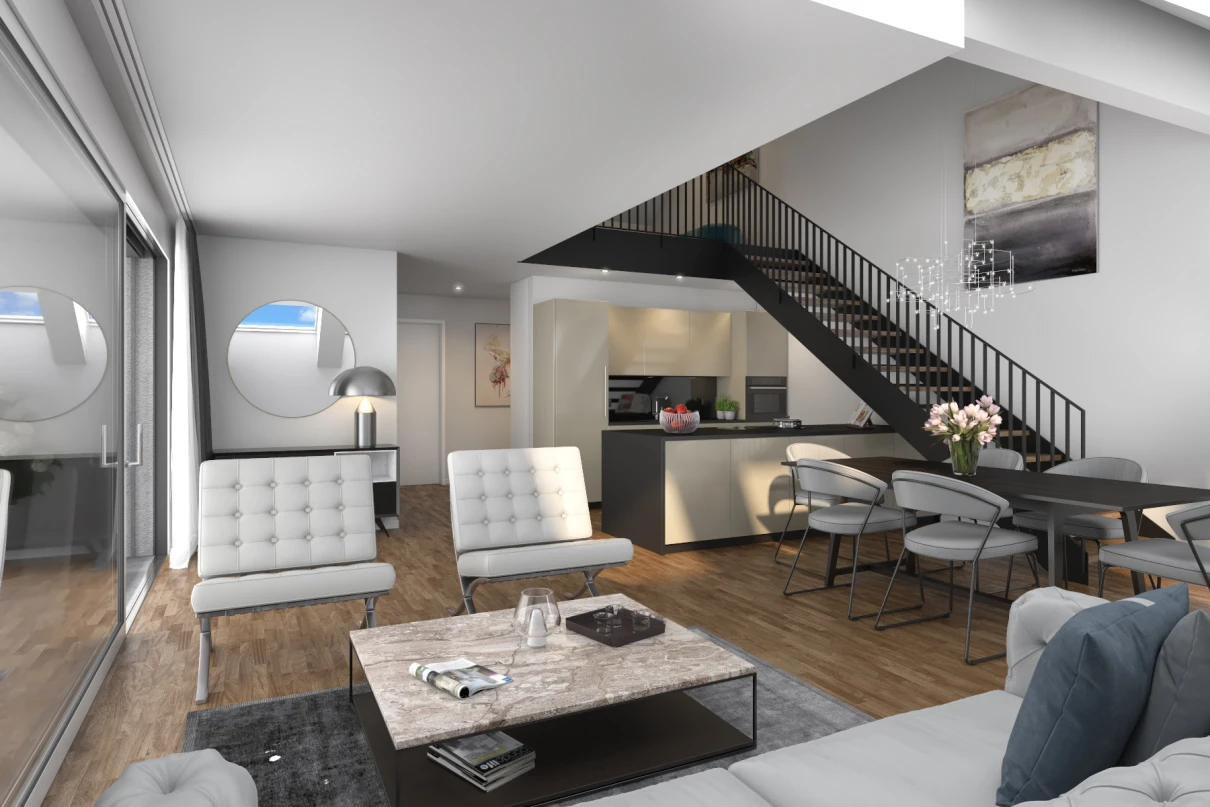 Unser Kronjuwel befindet sich im Dachgeschoss, wo eine geräumige Maisonetten-Wohnung mit 4.5 Zimmern darauf wartet, von Ihnen entdeckt zu werden. Mit seinem modernen Grundriss und eleganten Designs bietet es den perfekten Raum, um Ihren Lebensstil zu bereichern.