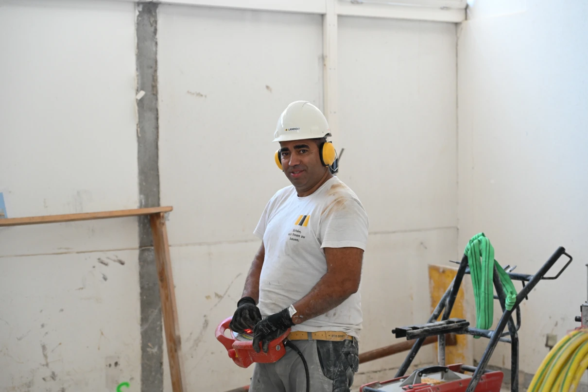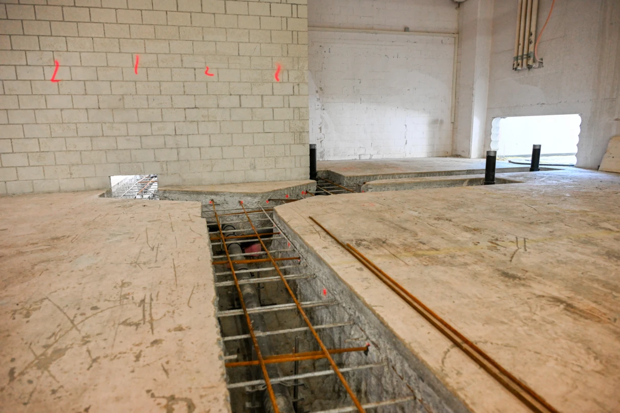 Unser Leistungsumfang umfasst das Erstellen von Bodenschlitzen in der bis zu 60 cm starken Bodenplatte mittels Hochdruckwasserstrahltechnik (HDW), diverse Maurerarbeiten sowie statische Verstärkungen durch den Einbau vorfabrizierter Beton- und Stahlstützen. Zusätzlich führen wir die Ortbetonarbeiten für die neuen Liftschächte aus.