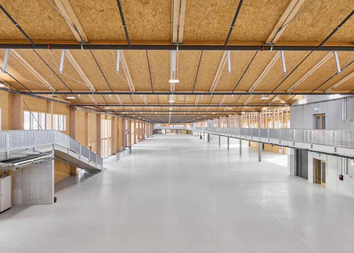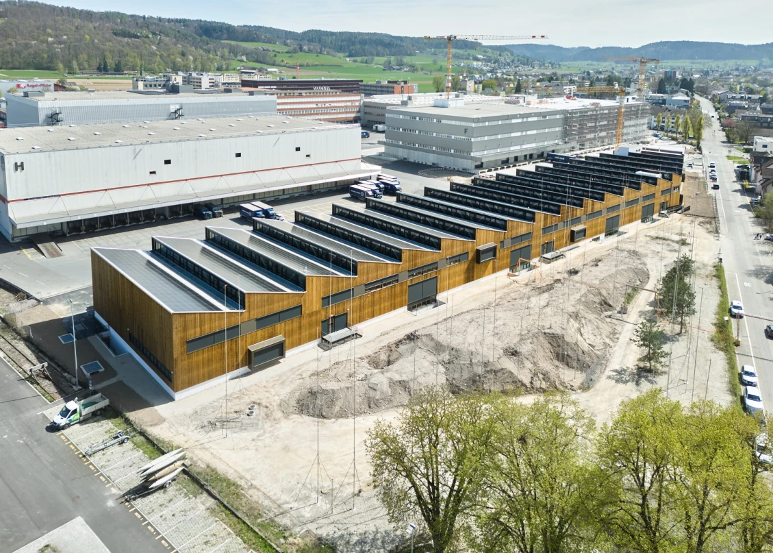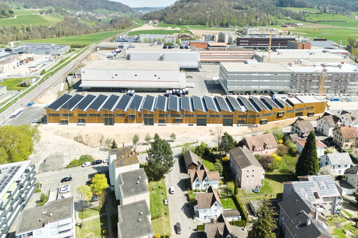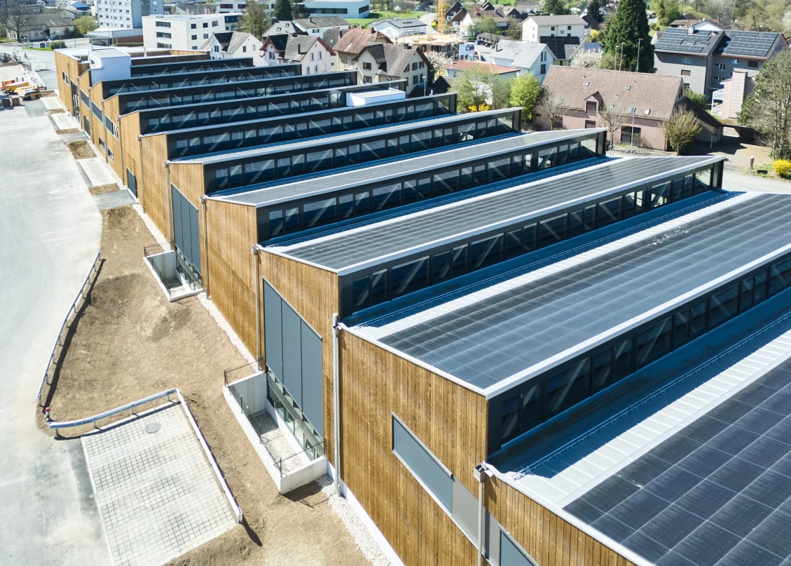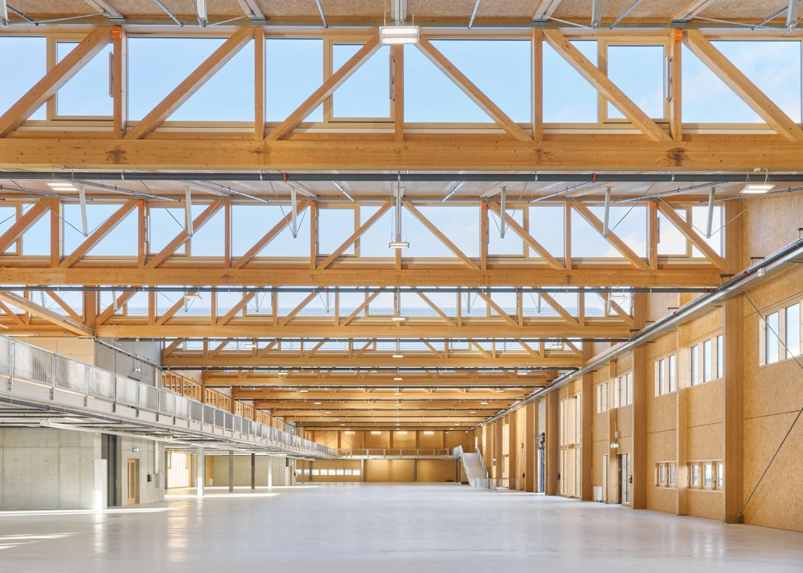 Die Produktionshalle Kyburz beeindruckt mit einer imposanten Hallenhöhe von bis zu 10,5 Metern. Ein markantes Merkmal dieser Halle ist ihre Konstruktion komplett aus Holz, was nicht nur ökologische Vorteile bietet, sondern auch eine warme und einladende Arbeitsumgebung schafft. Das Untergeschoss ist in Monobeton und Kalksandstein ausgeführt. Die Geschossfläche beträgt insgesamt 14.650 Quadratmeter, was ausreichend Platz für Produktionsanlagen und Lagerbereiche bietet. Mit einem beeindruckenden Gebäudevolumen von 86.000 Kubikmetern und Abmessungen von 230 Metern Länge und 30 Metern Breite ist die Produktionshalle Kyburz ein gelungenes Meisterwerk. Zusätzlich ist die komplette Dachfläche mit einer PV-Anlage ausgestattet, die nachhaltige Energieerzeugung unterstützt und die Umweltbelastung reduziert.
