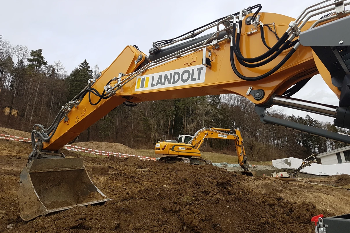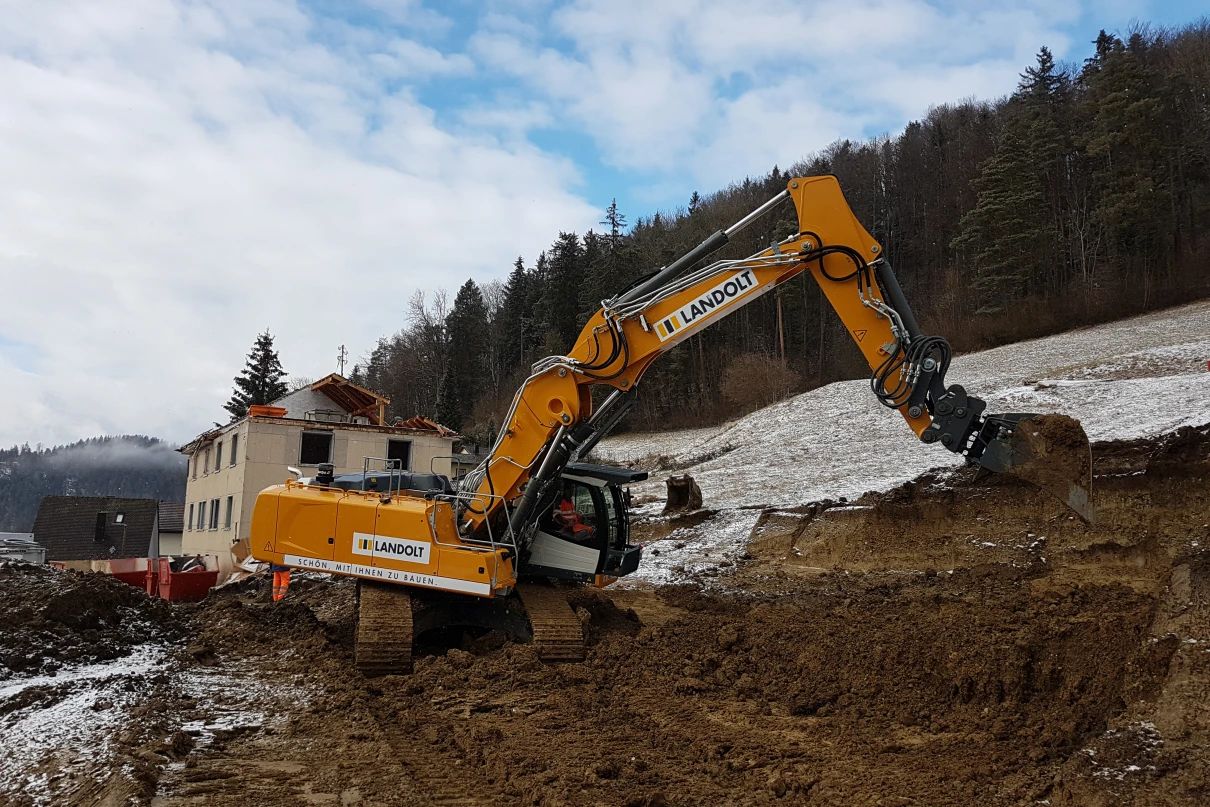 Die Aushubarbeiten wurden aufgrund der Hanglage abgetreppt auf mehreren Ebenen ausgeführt. Es mussten total ca. ca. 18`000 m³ Aushub abgegraben und abtransportiert werden.