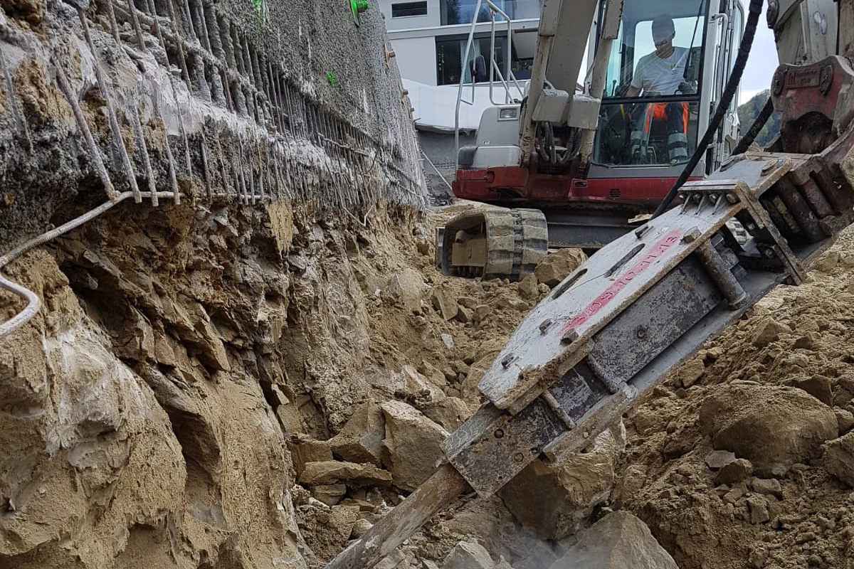 Die Hangsicherung musste aufgrund der steilen Lage mittels Bodenvernagelungen und Spritzbeton ausgeführt werden.