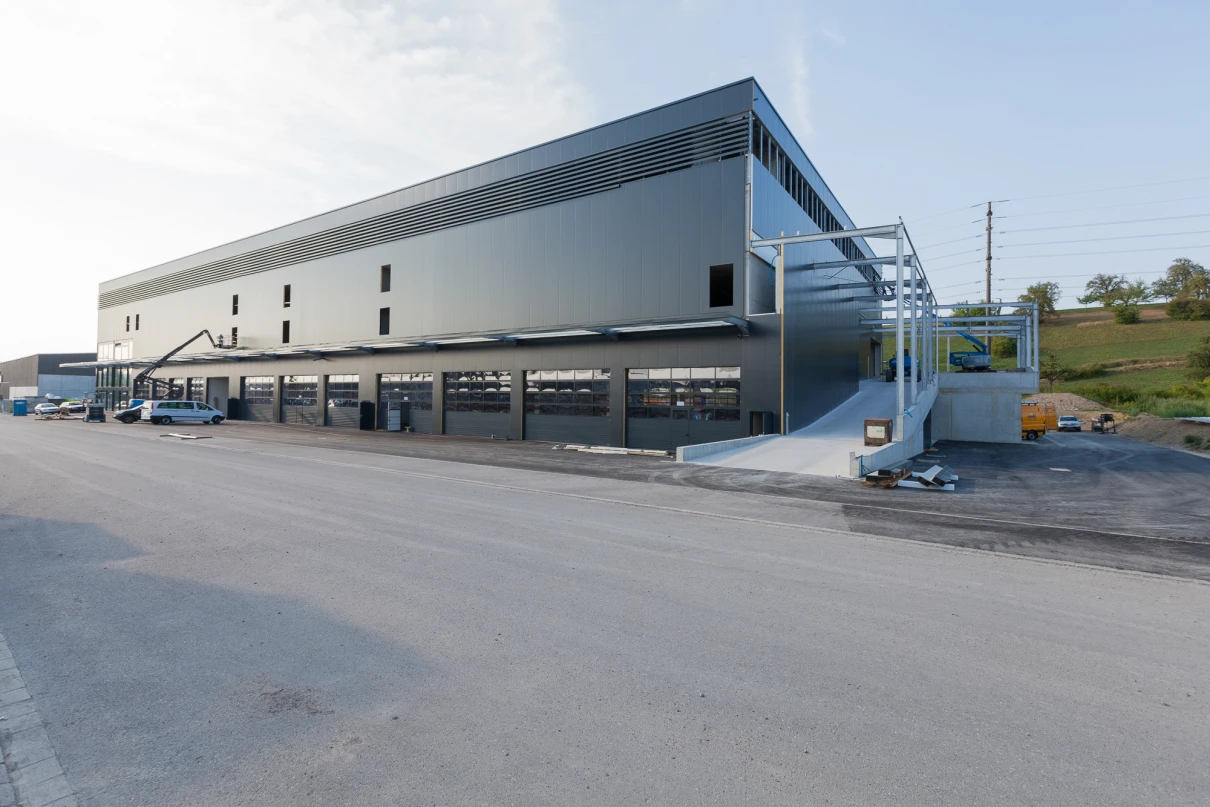 Neubau eines Betriebsgebäudes für die Firma Ryffel AG. Grundriss 100 x 41m, Bürogebäude fünfgeschossig, Lager, Werkstätten und Bus-Cardepot viergeschossig. Im obersten Stockwerk befindet sich die Autoeinstellhalle die durch innenliegende Rampen erschlossen wird.