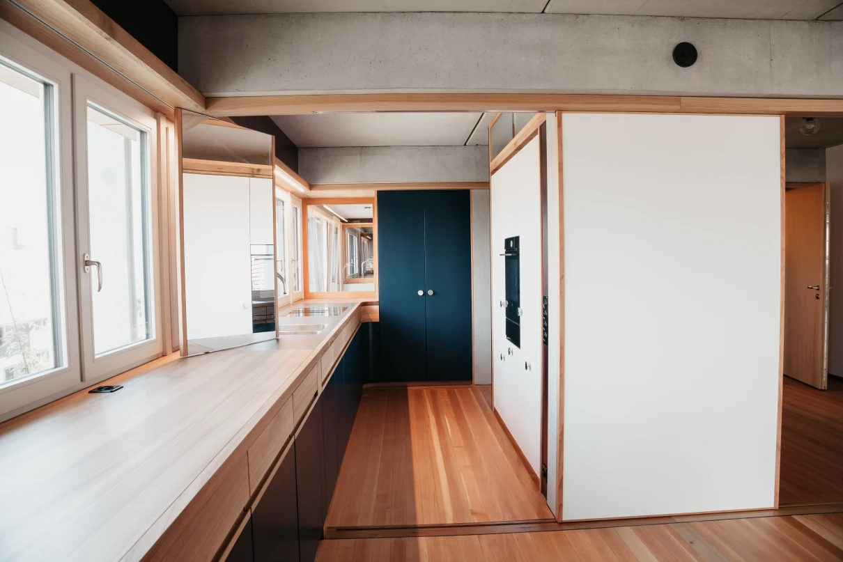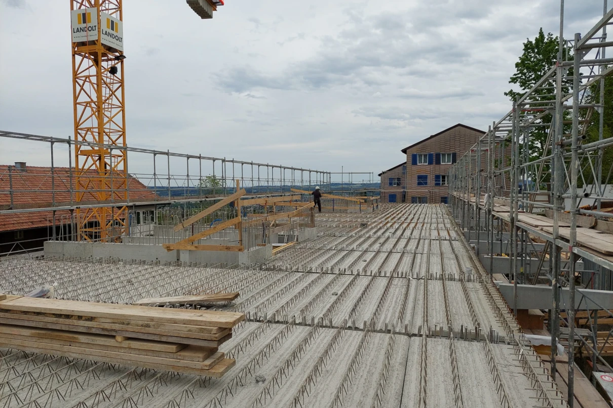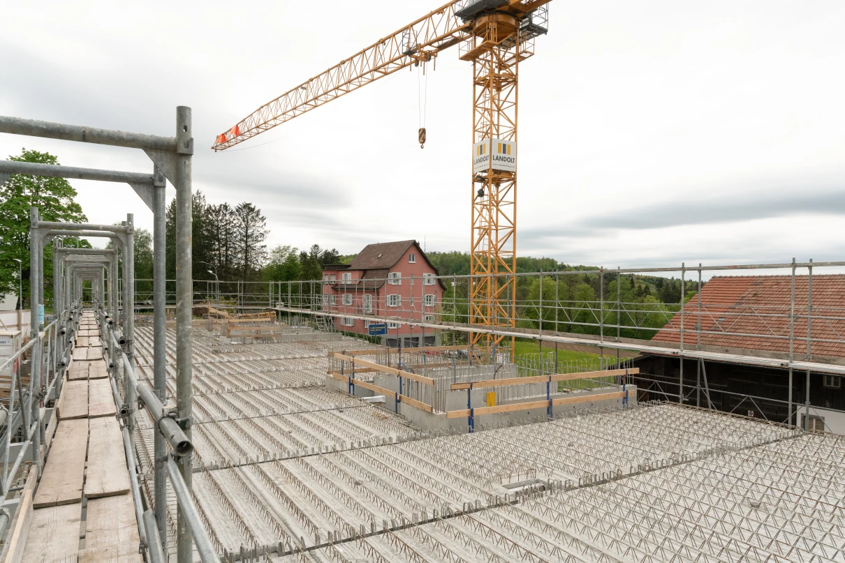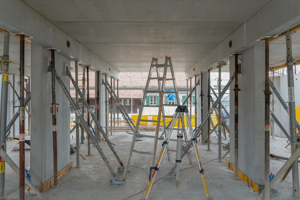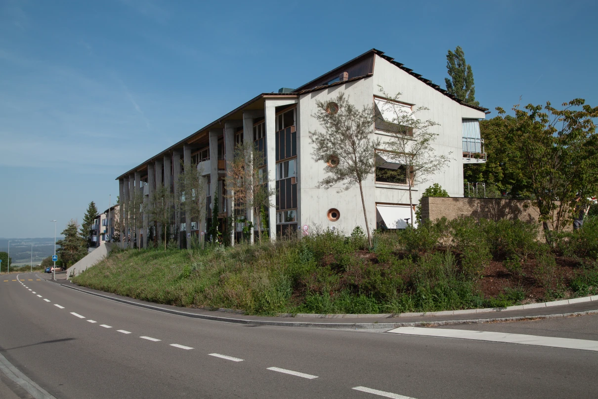 Das neue Wohnhaus fügt sich dank seines einfachen Gebäudekörpers sowie den zueinander versetzten Pultdächern gut in die Umgebung ein. Die beiden grosszügigen Treppenhäuser mit Liften erschliessen insgesamt 14 Wohnungen. Geprägt wird das Innere des Hauses mit vorfabrizierten Betonstützen und -unterzügen.
