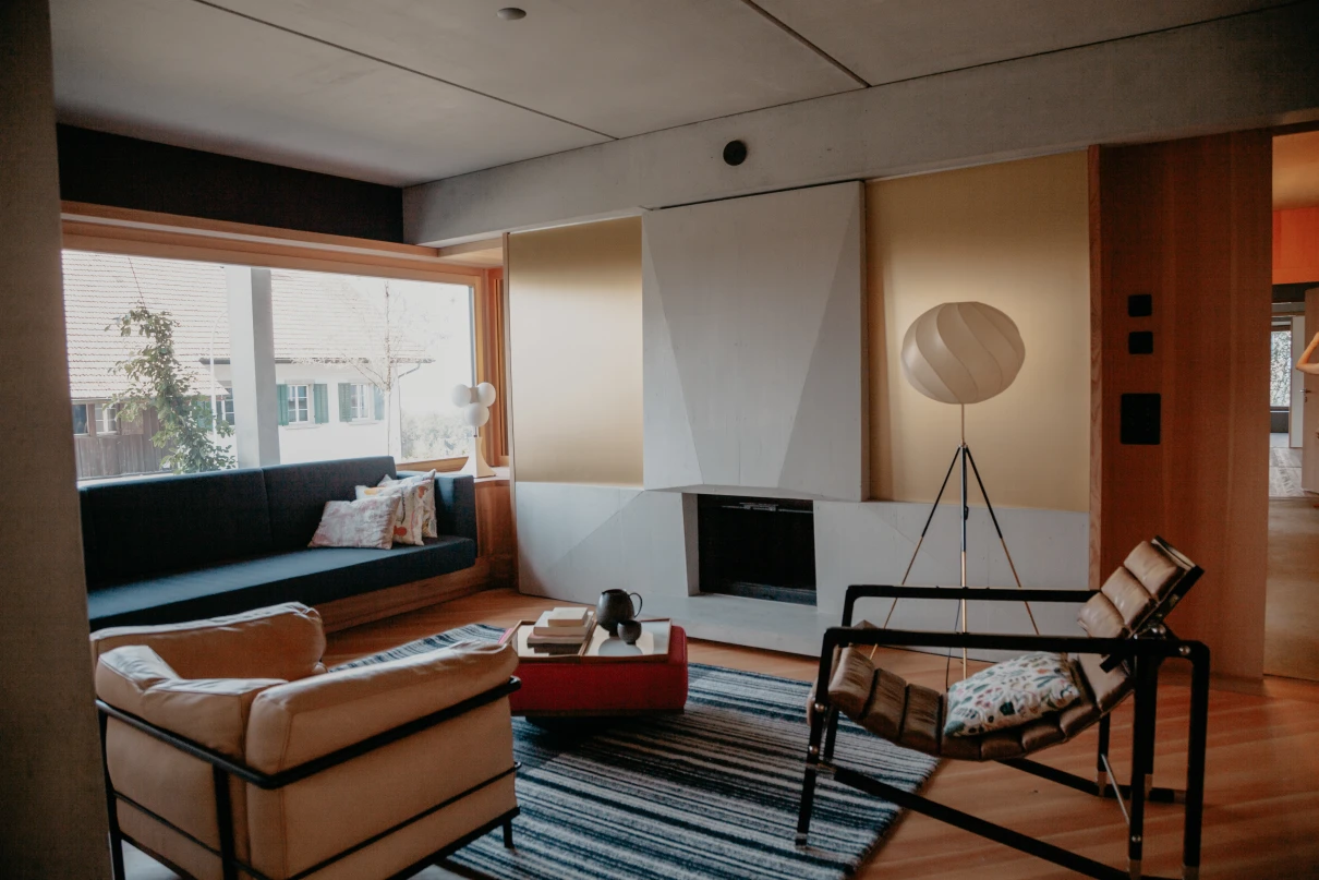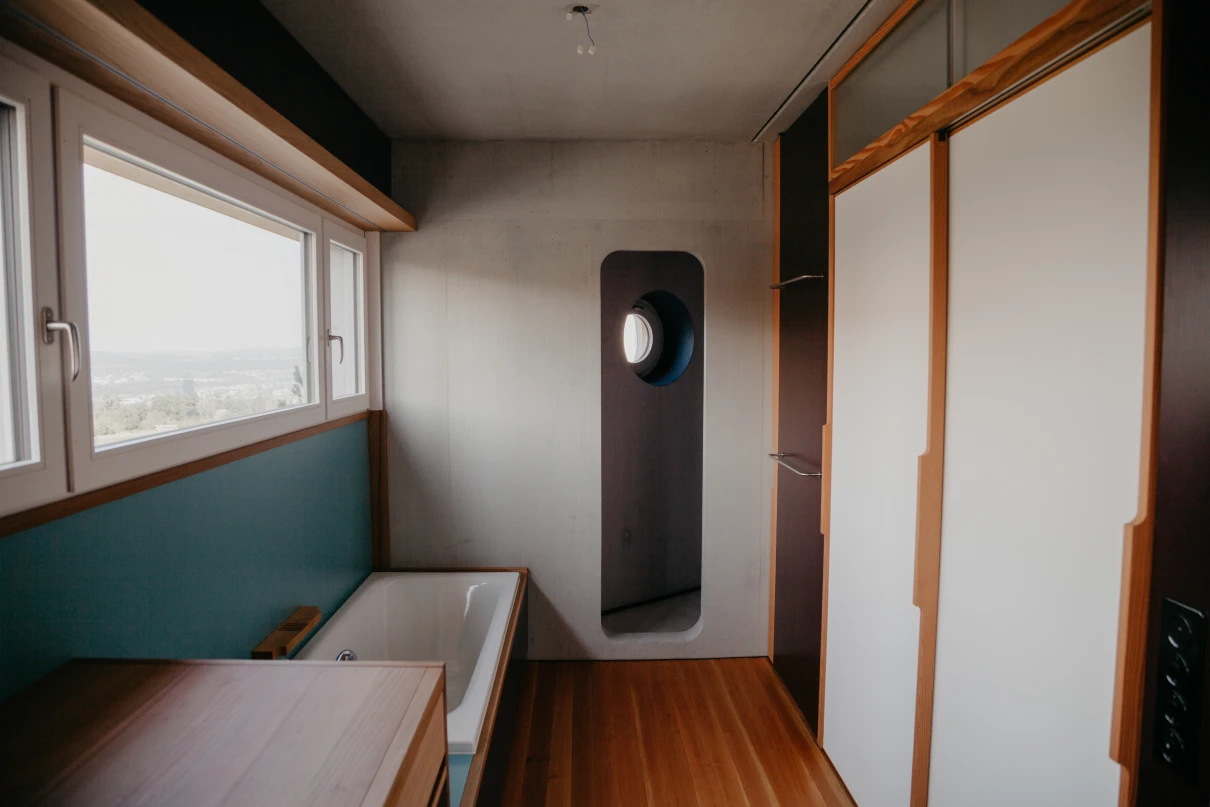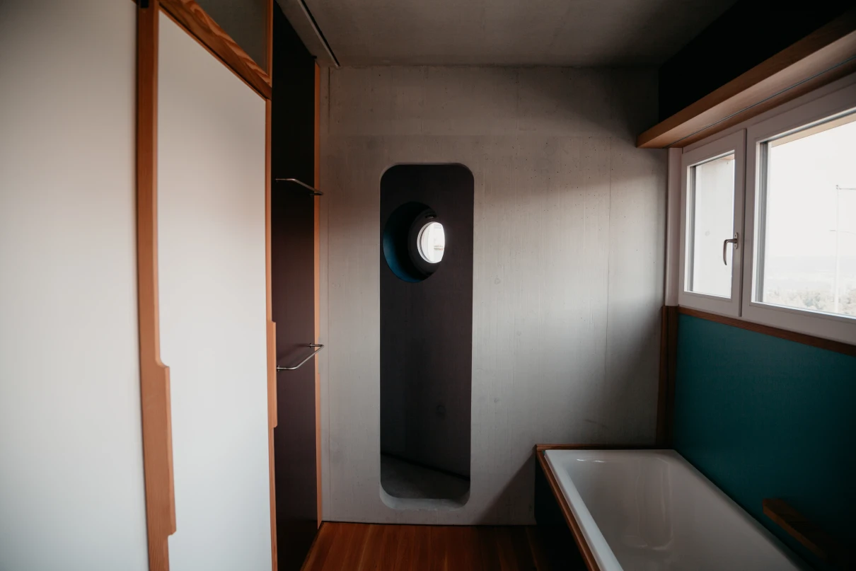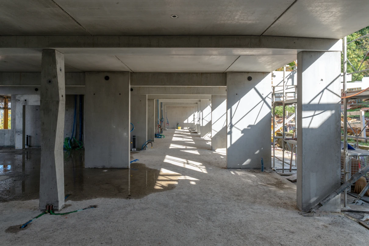 Das neue Wohnhaus fügt sich dank seines einfachen Gebäudekörpers sowie den zueinander versetzten Pultdächern gut in die Umgebung ein. Die beiden grosszügigen Treppenhäuser mit Liften erschliessen insgesamt 14 Wohnungen. Geprägt wird das Innere des Hauses mit vorfabrizierten Betonstützen und -unterzügen.