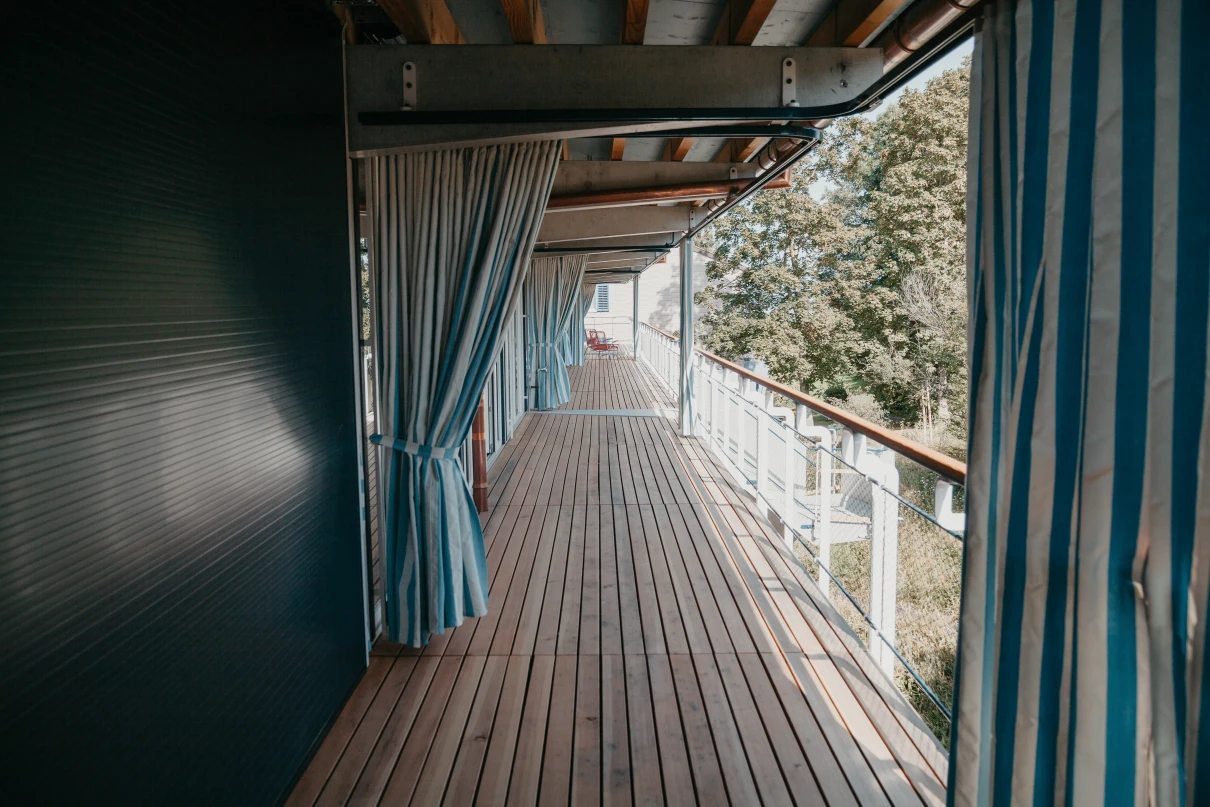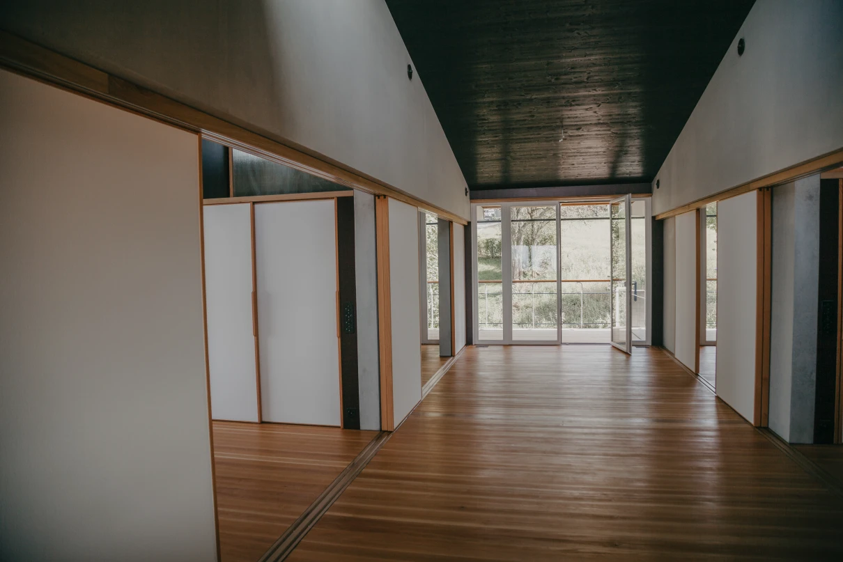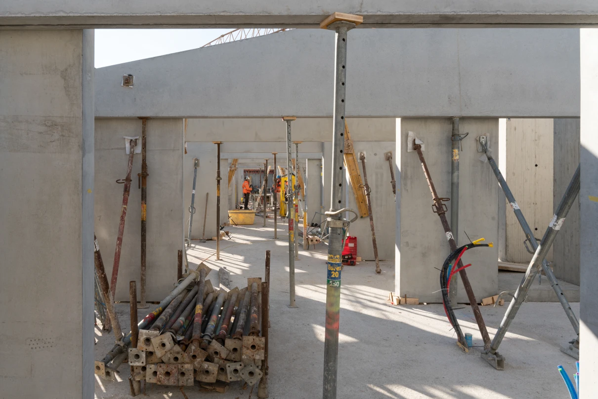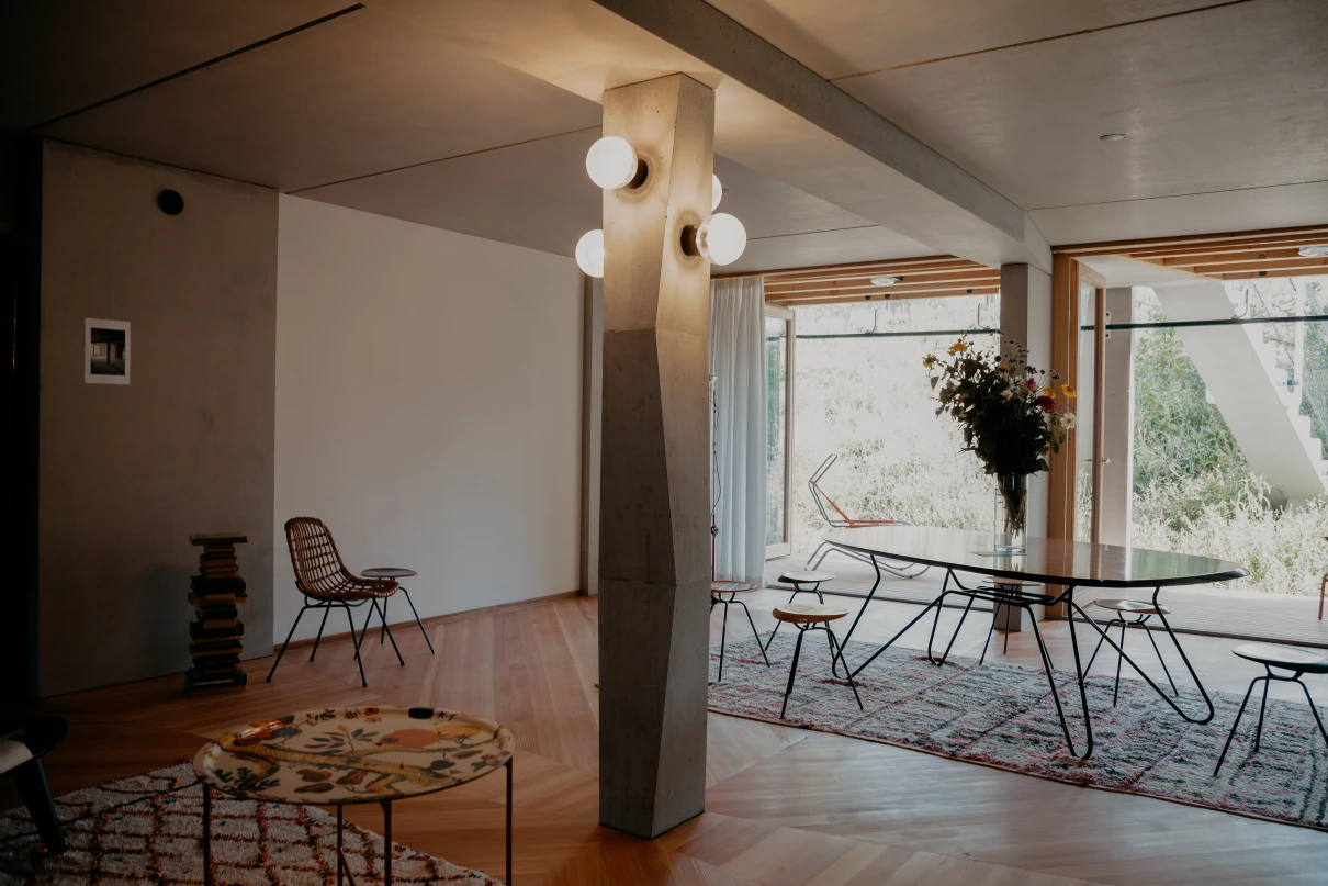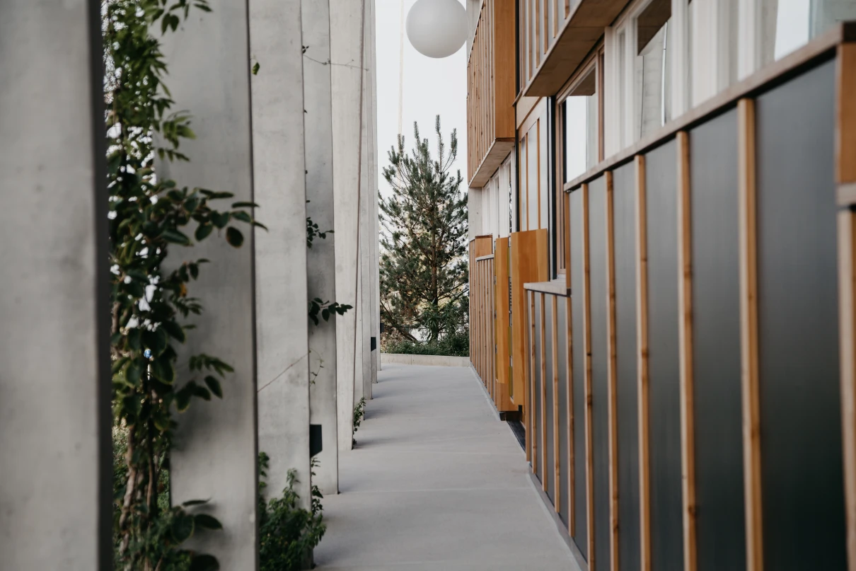 Das neue Wohnhaus fügt sich dank seines einfachen Gebäudekörpers sowie den zueinander versetzten Pultdächern gut in die Umgebung ein. Die beiden grosszügigen Treppenhäuser mit Liften erschliessen insgesamt 14 Wohnungen. Geprägt wird das Innere des Hauses mit vorfabrizierten Betonstützen und -unterzügen.